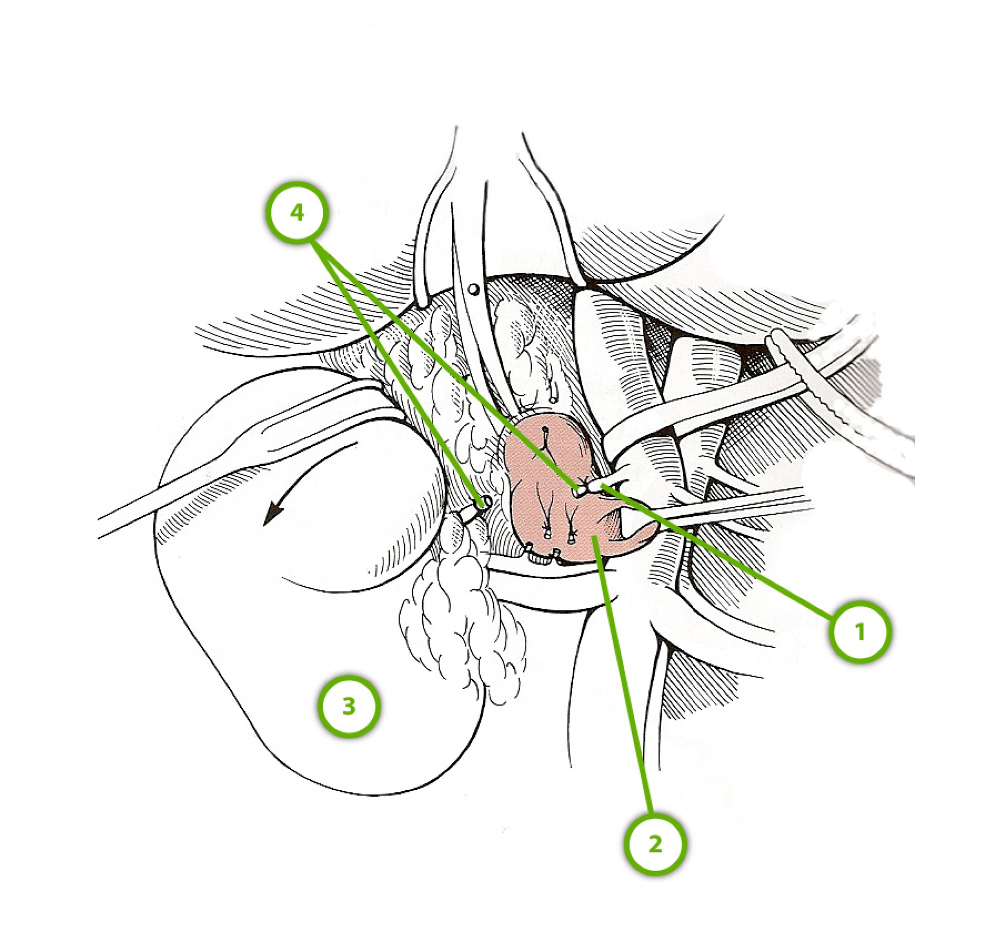 A mellékvese felett futó kisebb eret lekötjük és az elváltozott szervet a hasüregből eltávolítjuk. A jobb oldali mellékvese daganatos elváltozása esetén különös figyelmet kell fordítani arra, hogy az eltávolítandó szerv közvetlenül a hátulsó hasi vénán fekszik. Egyes esetben a daganat a hátulsó hasi vénába is besarjadzik, jelentősen csökkentve eltávolításának komplikációmentes lehetőségét.