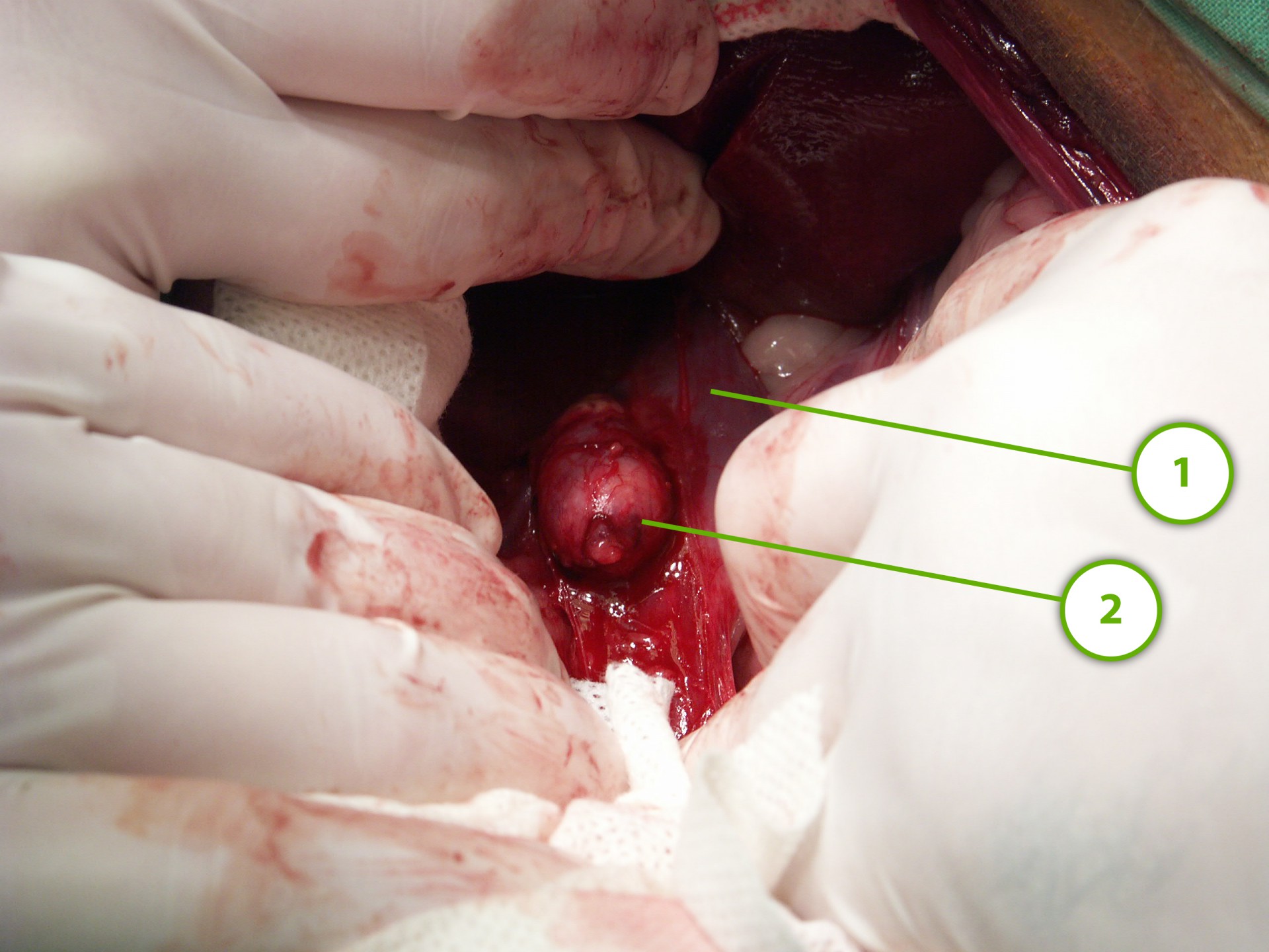 A műtét során az állatot az egészséges oldalára fektetjük és a hasüregbe bordaív mentén végzett metszéssel jutunk be.
